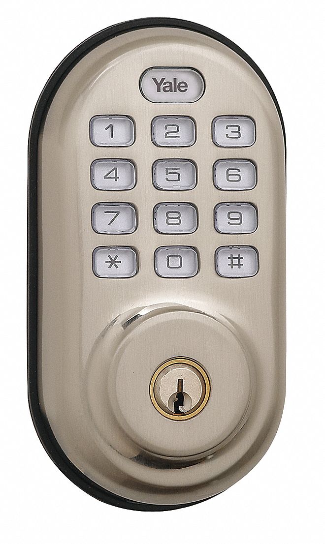 YALE Electronic Keyless Deadbolt, 13/16 in Backset, Cylindrical, Satin Nickel, 1 in Latch